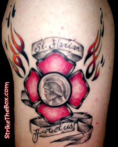 Country: United States State: Montana Fire Dept: Hill City Fire and Ambulance Years on job: 3 Rank: Firefighter (private) Description: this piece was drawn by a friend of mine with the inspiration of some of the other tattoos featured on strike the box . Tattoo Location: left arm Year Inked: 2006 Studio: Thrash's Living Art in Rapid City SD Artist: Geno |