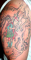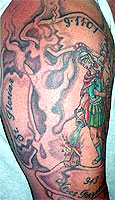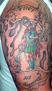 Country: United States Fire Dept: Questa Fire Department State: New Mexico Years on job: 10 Rank: Assistant Chief Description: I got St. Florian in a Maltese Cross with 9-11-01 343 memorial. Tattoo Location: right arm Year Inked: 2006 Studio: Scaredy-Cat Tats Artist: Kerry Vialpando |