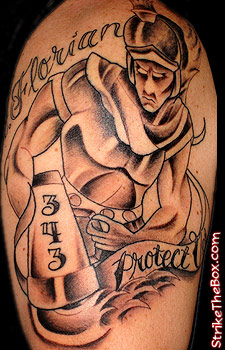 Country: United States State: Ohio Fire Dept: Toledo Fire & Rescue Dept. Year Started in Fire Service: 1989 Rank: Lieutenant Description: I always wanted a tattoo on my upper arm but could not decide on a image. Then one day I forgot to wear my St. Florian Medal to work and I felt very strange without it. I decided to tattoo a image of St. Florian the Patron Saint of all firefighters on my arm so I would have him with me at all times for protection. Tattoo Location: Right Upper Arm Year Inked: 2008 Studio: Body Design Artist: Boomer  |