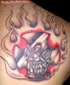 David Country: United States State: South Carolina Fire Dept: Oconee County Year Started in Fire Service: 1991 Rank: Other Description: I wanted a St. Florian but wanted it to be different. I combined a couple of ideas and the artist was able to incorporate the maltese cross and flames. Tattoo Location: Right Shoulder Year Inked: 2008  |
