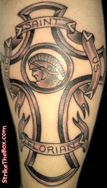 Description: i had come up with the idea to have 3 crosses on top of one another with st. florians head in the middle on a medallion ... then wanted "saint florian protect us" written on the cross.