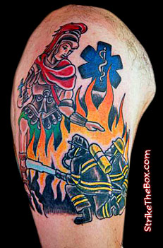 Description: I'm a Firefighter / EMT and my father has been a fire fighter for about 15 years now on the same dept. He's an Lt (hence the yellow helmet on the rear firefighter). The two firefighters represent me and him with St. Florian with his hand over both of us protecting us. Also the EMS cross in the air.