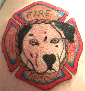 Country: United States Fire Dept: Schuyler Hose Co. State: New York Years on job: 16 rank: Firefighter (private) Description: I chose this tattoo to keep my dog Captain in my memories for a long time, he is now 11 1/2 and the best dog I ever had. Tattoo Location: right arm Studio: Tattooed Troll Artist: Gene |