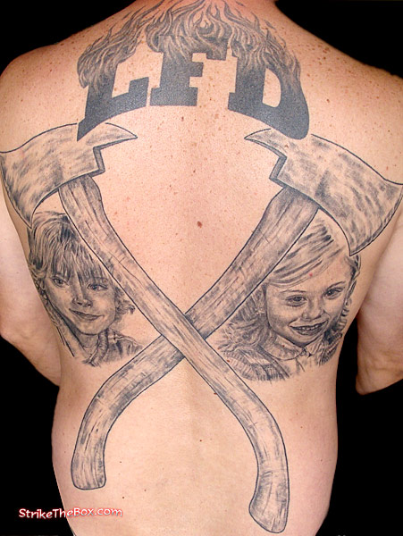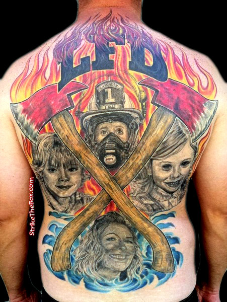Sean Gale Country: Canada State: Ontario Fire Dept: Lakeshore Year Started in Fire Service: 8 Rank: Firefighter (private) Description: I wanted to mix my family with a fire theme backpiece. So here is the start of it. Year Inked: 2008 updated tattoo added in 2012 Studio: Black Sheep Artist: Tim Reid