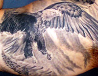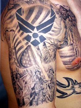 Country: United States Fire Dept: Saint Paul State: Minnesota Years on job: 1 Rank: Firefighter (private) Description: Since I laid eyes on this 9/11 picture I loved it. My old Air Force tatt is on the top. We changed the flag and added a lady liberty and the towers. An eagle is on the inside of my arm. And last but now least, the Korean war memorial on my chest is for my grandfather who just passed away. i also have an F-22 coming out of the clouds behind the flag on my back. More to come. Tattoo Location: Right arm/chest/back Year Inked: 2005 Studio: Get to The Point Artist: Matt Lampi Tattoo of the Week - March 11, 2006 |