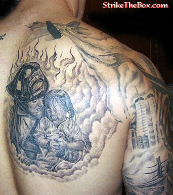 Country: United States Fire Dept: St. Paul State: Minnesota Years on job: 2 Rank: Firefighter (private) Description: Found this picture and had to have it added on to my 9/11 sleeve. Tattoo Location: right shoulder Year Inked: 2006 Studio: Get To The Point Tattoo Artist: Matt Lampi |