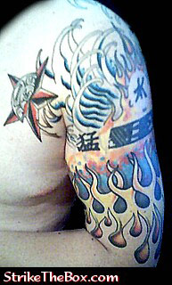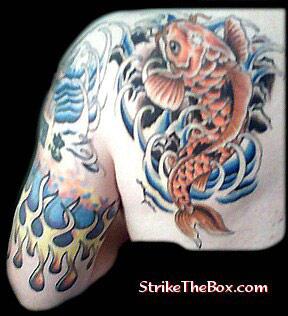 Country: United States Fire Dept: Springfield Twp. Fire Dept. State: Ohio Years on job: 6 1/2 Rank: Firefighter (private) Description: It started out as a tribal in the center that means "stairway to heaven". I then kept adding to it with the different symbolisms in my life. Lots of fire with water on top, kanji symbols meaning loyalty, bravery, and water over fire. A nautical star means to find my way home safely with a firefighter mizpah coin half on top (my wife has the other half of the coin tattooed on top of her nautical star). I then went with the Koi fish to symbolize striving for and reaching my goals. Since my FD won't let me have a full sleeve, I figured I would keep adding the other direction....up. Tattoo Location: Left arm, shoulder, and back Year Inked: Started in 1996 getting close to being finished, maybe.. Studio: Started out at Uptown Tattoo, being completed by Staygold Artist: Sagent Staygold - Staygold tattoo |