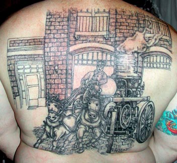 Country: United States Fire Dept: Sioux Falls Fire Rescue State: South Dakota Years on job: 24 Rank: Assistant Chief Description: Back piece continuation with Central Fire Station in the background. Please update my existing tat on here Tattoo Location: Back Year Inked: 2005 Studio: Skin & Bones Artist: Bones |