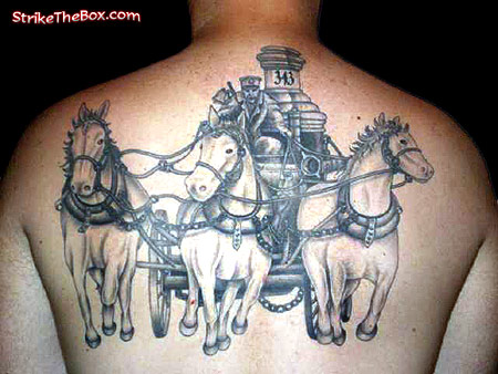 Country: United States State: Missouri Fire Dept: Cottleville Fire District Year Started in Fire Service: 1994 Rank: Firefighter (private) Description: I wanted a tribute that was simple but but made you say holy sh*#. Tattoo Location: Back Year Inked: Dec. 2005 to Feb. 2006 Studio: Full Moon Tattoo Wentzville Missouri Artist: Wolfman |