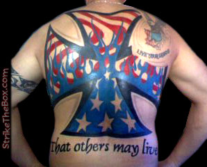 Brannan "Boot" Campbell Country: United States State: California Fire Dept: CAL FIRE Year Started in Fire Service: 2003 Description: I wanted to do something different than the usual firemen tattoos, so I went big with a Maltese Cross with the American theme. The my "tramp" stamp is something I live by at work. That others may live. Tattoo Location: Back Year Inked: 2008 Studio: Inky Cells Artist: Dana |