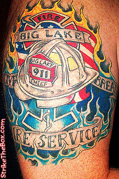 Description: My tattoo is a compilation of achievements made possible by my loving and supporting wife and daughter. It displays my belief that it's not about the calls, it's about the service "Live and Breathe Fire Service". Pride in my country, Department "Big Lake", becoming an EMT and eventually becoming Chief of my Dept. Finally remembering those souls who lost their lives on 09-11-01. All surrounded in the trials by Fire that is life.