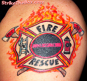 Adam Bailey Country: United States Fire Dept: Toledo Fire & Rescue State: Oregon Years on job: 1 1/2 with Toledo, 8 total Rank: Lieutenant Description: I wanted something to show my dedication to the fire service and honor those who have been injured or killed in the line of duty. I thought incorporating the thin red line and 343 would do just that. I also included my kids initials in the axes so that they are always a part of me and keep me safe while I am in harms way. Tattoo Location: Right upper arm Year Inked: 2006 Studio: CrossOver Artist: Justin |