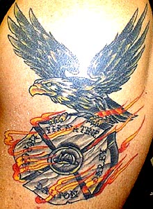 name: Curtis D Country: United States Fire Dept: St. Johns County State: Florida Years on job: 6 Rank: Firefighter (private) Description: I wanted to have my childern with me at all times. The eagle represents when I'm away, my brothers will protect them. Tattoo Location: Left upper arm Year Inked: 2005 Studio: Ocala tattoo Artist: Seathen |