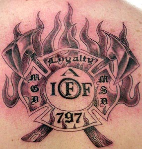 name: ryan demers Country: United States Fire Dept: auburn State: Maine Years on job: 2 Rank: Firefighter (private) Description: I wanted to incorporate my love of the fire department and my children, so I went to a highly skilled artist named Eric Wing to put my thoughts on my skin. Tattoo Location: upper back Year Inked: 2006 Studio: Altered Image Tattoo Artist: Eric Wing |