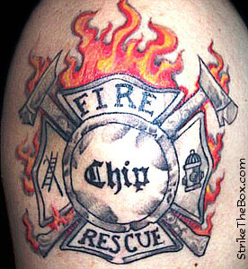 Country: United States Fire Dept: Stephens City and Middletown Fire and Rescue State: Virginia Years on job: 3 Rank: Other Description: A badge of honor created for myself, for facing my worst fears and conquering them. As a Firefighter/EMT nothing seems impossible now. Tattoo Location: Right Shoulder Area Year Inked: 2006 Studio: State of the Art Tattooing Winchester Virginia Artist: Michael Sarao |