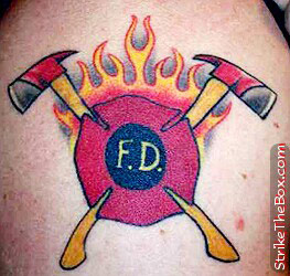 Adam Hartle Country: United States Fire Dept: Clarion Fire and Hose Company #1 State: Pennsylvania Years on job: 3 Rank: Firefighter (private) Description: Got the cross with the F.D. first then got the axes and the flames put on later, and glad I did. Tattoo Location: Right Bicep Year Inked: 2005-2006 Studio: Studio 13 |