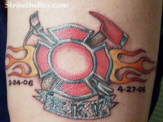 Marc Kampy Country: United States Fire Dept: Pleasant Valley State: Missouri Years on job: 4 Rank: Firefighter (private) Description: combonation of ideas from this site. Initials are of my infant daughter who died soon after birth. Tattoo Location: Left shoulder Year Inked: 2006 Studio: Done Rite Artist: Spike |