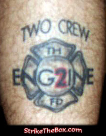 Country: United States State: Connecticut Fire Dept: Tunxis Hose Co. No. 1 Years on job: 1.5 Rank: Firefighter (private) Description: I got this in memory of the summer before I left for bootcamp while I was still a cadet. There were a few of us that were always on Engine 2 and people started calling us "Two Crew." Tattoo Location: Side of Right Calf Year Inked: 2006 Studio: Buzz Jr. |