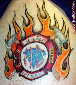 Country: United States State: South Carolina Fire Dept: City of Darlington Fire Dept. Year Started in Fire Service: 1990 Rank: Lieutenant Description: I been figthing fire 16 yrs and riding my Harley Davidson for 2 1/2 yrs . I married the too in this tattoo where I put Live to Fight and Live to Ride to show support to what I love to do. Tattoo Location: Upper Left arm Year Inked: 2007 Studio: Tony's Tattoos Artist: Tony |