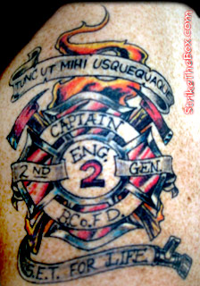 Country: United States State: Pennsylvania Fire Dept: Baltimore County Career Year Started in Fire Service: 1985 Rank: Captain Description: Tribute to my late father who was also a Baltimore County Firefighter. The Latin says, "next to me always". The S.E.T. are my wife and two kids initials. I have an appointment to have an armband added to it. Tattoo Location: Right bicep Year Inked: 2007 Studio: Tiki Tatoo Westminster Maryland Artist: Jason |