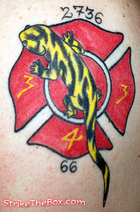 Country: United States State: California Fire Dept: Sacramento Metro FD Years on job: 2 Rank: Firefighter (private) Description: This tattoo actually has several parts. The cross is obvious, as is the 343. the numbers above and below are my badge number at work, as well as at mu Vol. dept. The salamander is from Fahrenheit 451. Tattoo Location: Right Arm Year Inked: 2006 Studio: American Graffiti Artist: Johnny |