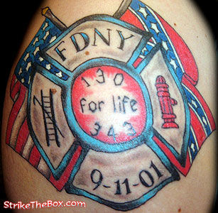 Country: United States State: Pennsylvania Fire Dept: Union Fire Co. 130 Years on job: 10 Rank: Firefighter (private) Description: This was my first tat it only took 6 yrs. to finally know what I wanted. I also desinged it myself. Tattoo Location: Right arm Year Inked: 2007 Studio: Elmer's Tattooing Artist: Elmer |