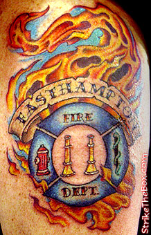 Dennis Peck Country: United States State: Massachusetts Fire Dept: Easthampton Fire Dept. Year Started in Fire Service: 1980 Rank: Captain Description: It took me 5 years to decide on my first tattoo. At the age of 45 and in celebration of my 20 th year with EFD, this is what decided on. Tattoo Location: Left upper arm Year Inked: 2008 Studio: Pisst Fish Tattoo Company Artist: Krystof |