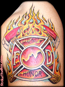 Scott Country: United States State: Texas Fire Dept: CCFD Year Started in Fire Service: 2008 Rank: Firefighter (private) Description: Wanted a tattoo that had some meaning. "Strength" -for which I ask GOD for before each shift, & "honor"-for which I show to my fellow brothers and the fire service. Tattoo Location: left delt Year Inked: 2008 Studio: Shipwreck Tattoos Artist: Bruce Morgan |