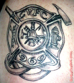 Country: United States State: New Jersey Fire Dept: Cassville Volunteer Fire Company Year Started in Fire Service: 2006 Rank: Firefighter (private) Description: I wanted to get something to represent the time and dedication it takes. I also wanted to change the usual crossed axes because I ride the engine. So I made the change and added a hose and nozzle to cross with the ax. Tattoo Location: upper left arm Year Inked: 2008 Studio: South Side Artist: Troy |