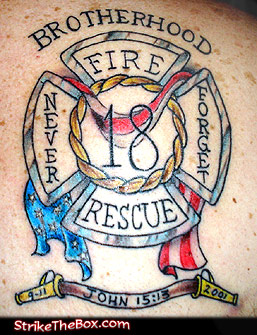 Bob Easom Country: United States State: Delaware Fire Dept: Good Will Fire Company Year Started in Fire Service: 1996 Rank: Firefighter (private) Description: Wanted a tattoo that meant something other than a regular fire tattoo. I had this drawn up by my cousin who also did the inking. Tattoo Location: Right Shoulder Blade Year Inked: 2008 Studio: Expolsive Tattoo and Body Piercing Artist: Jimmy Kemp |