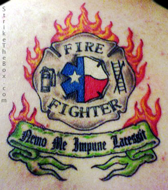 Billy Anderson Country: United States State: Texas Fire Dept: Krum Year Started in Fire Service: 2007 Rank: Firefighter (private) Description: I always wanted a tattoo, and after joining the fire service I wanted something that would show my pride and respect for what I do. The text is in Latin and translates to "None provoke me with impunity (no punishment)" coming from both law enforcement and fire service I thought it would be fitting. Tattoo Location: Upper Middle Back Year Inked: 2007 Studio: Ace's tattoo's in Denton Artist: Rick