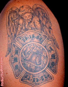 Derek Owen Country: United States State: North Carolina Fire Dept: Southmont Fire department Year Started in Fire Service: Sept. 2004 Rank: Firefighter (private) Description: The maltese cross represents me. The initials and dates represent my two children and our gaurdian angel watches over us from above. Tattoo Location: Upper Left Arm Year Inked: January 2008 Studio: View Askew Artist: Jason Sheely