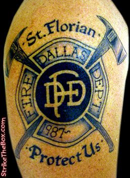 Country: United States State: Texas Fire Dept: Dallas Fire Department Year Started in Fire Service: 1987 Rank: Other Description: I wanted a tattoo to show my dedication to the Dallas Fire Department and being a Catholic. Tattoo Location: Right Bicep Year Inked: 2008 Studio: Hold Fast Artist: Adam |