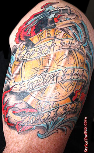 Mike Country: Canada State: British Columbia Fire Dept: Fort Erie Fire dept Rank: choose one Description: Tribute to the job and the my 3 children. Cherish, Jake & Fallyn. Tattoo Location: Left arm Year Inked: 2010 Studio: Seven Crowns Tattoo Artist: George Brown