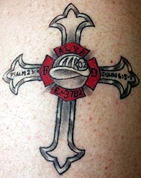 Belongs to Phil Burrow with the Alva Fire Department Alva, Oklahoma. " I have been a fire fighter for 18 years and am now the assistant fire chief. This tattoo is of a cross I once seen and liked adding to it some of my favorite scriptures, the white helmet with my badge number then the Maltese cross with our IAFF local number on it." Inked by Mike Shea, owner of Skinsations Tattoo. |