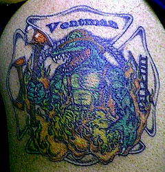 Firefighter /EMT Tattoo by Tattoo Master Tattoo is of a Mutant Gator walking out of flames,U of F Gator fan! |