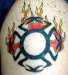 This STB inspired tattoo belongs to Clint Sanchez, a career firefighter since 1997 with the Baton Rouge Fire Department. Clint is also a volunteer with the Livingston Parish Fire District 10 (www.district10fire.com) located in Holden, Louisiana. "After looking at your site for numerous months, I decided it was time for me to get a tattoo. It was hard choosing one, however I must give credit to Chris Dunne (http://www.strikethebox.com/tattoo/irish_scottish/dunne/index.htm), for it was his tribal Maltese cross that I took mine from. I had it inked at Tattoo's By Dody in Gonzales, LA simply because he is highly regarded as the best in the state. Dody was extremely professional, and made getting inked enjoyable. It took him 2 hours to do the tat, which I spent watching my wife get one on her lower back (a sunflower), as this was our 1st anniversary present to each other." |
