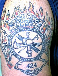 This tattoo belongs to firefighter/EMT Mike Hancock (aka Mutt) Mutt is with the Bartow Fire & Rescue, Bartow Fl. His two Brothers also have tatts on the site. Tattoo
