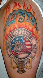 This original design was sent to us by Jeff Trotter. " I am a Captain with the Crescent City Volunteer Fire Department in Crescent City, Ca. I had this Tat inked by Shawn at Skinsignia in Eureka Ca. I designed this Tat myself putting several different fire related things together. Hope your visitors enjoy the pic and to all the fire fighting men and women in the world, Stay safe and protect one another. " |