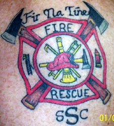 "I am a 12 year veteran of the Sapulpa Ok fire dept. Where Iam the driver of E-5. I had this tat inked at INTRADERMAL DESISNS in Denton Tx. by Daniel.The Ssc is for my wife and kids." |