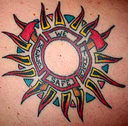 From Dean Krupa. Dean is also President of the local chapter of the Red Knights, Alberta 3. " I am a firefighter with the Calgary Fire Dept. in Calgary, Alberta, Canada. I got it 3 years ago after getting out of fire school but it isn't finished yet.....I still want to put something in the middle of the Maltese cross and jazz it up around the outside.....fill in some of the "dead" space.. It is my original design and I had a buddy of mine draw it out. I had it inked by Trevor at Winnipeg's Finest Tattoo Studio in Winnipeg, Manitoba...here's the link to the tat shop's site: www.wpgsfinesttattoo.com " |
