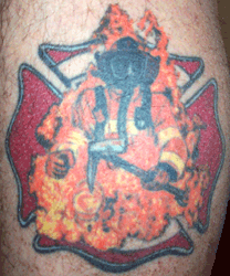 Plymouth Fire Rescue Wayne at Screaming Needles Tattoo Plymouth, NH "The flames glow under a black light" |