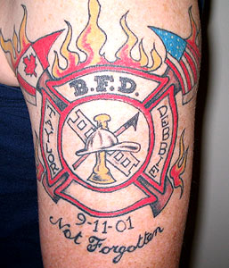 Country: Canada Fire Dept: Brampton Fire & Emergency Services State: Ontario Years on job: 4 Rank: Firefighter (private) Description: My tattoo shows the love's in my life, the Fire Department and my family! Tattoo Location: Upper left arm Year Inked: 2005 Studio: Indelidebly Yours Artist: Richard Bear |