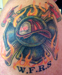Bill Loma Country: Canada Fire Dept: Windsor State: Ontario Years on job: 33 1/2 rank: Captain Description: My son and I are on the same Dept. I decided to go with a Maltese cross with a helmet and axes. My date of hire and his date of hire are on the axe heads. When he got hired I was already a Captain and the Dept. gave him my old badge no. which is on the helmet. Tattoo Location: Right arm Studio: Internal Expressions Artist: Tim Reid |