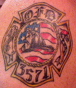 This great tattoo belongs to Lt. Mike Pelletier, Orlando Fire Dept, E-2A. "Design was developed by me with FF Nick Tuten, OFD. Artist was Heidi at Incredible Ink, 1 S. Orange Ave., Orlando. (407) 843-3666. The "battle" ax has my wife's inititals in it - ;) The bugle scroll has my kids middle names. My employee number is the 3571 on the bottom. " |