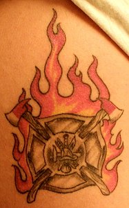 Joe Mancos "This custom tat was done in Feb. of 2002 by Shane at Liquid Temptations In Southern Pines N.C. I'm a Capt. On Pinebluff Vol. Fire Dept. and a career Paramedic with the local EMS service."