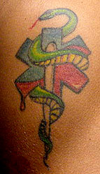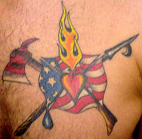 Both tats were drawn by me. The first after paramedic graduation. The second after completing fire equipment operators testing. studio: The Tattooed Heart artist: Roger |