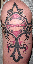 This great design belongs to James M. Mitchell Career: Full time FF/EMT-I and member of Polar Star Lodge #114, Bath, Maine Fire House: Brunswick Fire Department, Maine Inked By: Inked by Bonnie from Tattoos By Bonnie, Brunswick, Maine Designed: By James - Tribal Cross with a Maltese Cross baring a mourning strip with the word Brotherhood scrolling acrossed it, in masonic script. "Hold true to your faith in God, Country and the Brotherhood." |