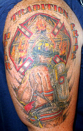 to show why I am a firefighter..Tradition..Pride.. Tattoo Location: right arm Studio: The Artist's Edge Artist: Permanent Mark