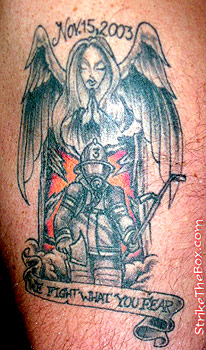 Country: United States State: Maryland Fire Dept: Baltimore County Fire Department Year Started in Fire Service: 1983 Rank: Firefighter (private) Description: In 2003 myself and another firefighter survived a flashover. Afterwards we got matching tattoos to remember how lucky we were to be alive. Tattoo Location: left arm Year Inked: 2006 Studio: Tiki Tattoo Artist: Jason |